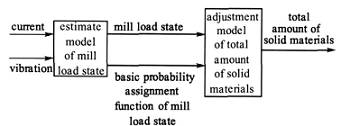 根據(jù)生料漿配料過程的實際需求,本文將球磨機負荷狀態(tài)分為4 類: u1 代表欠負荷狀態(tài), u2代表最佳負荷狀態(tài), u3 代表過負荷狀態(tài),集合D= { u1 , u2 , u3 } 代表球磨機負荷的不確定狀態(tài)。球磨機負荷優(yōu)化控制方法由負荷狀態(tài)估計模型和干料總量調(diào)整模型組成, 其結(jié)構(gòu)如圖所示。